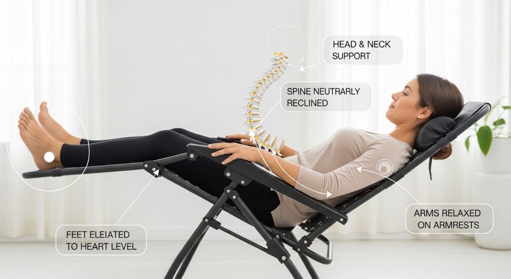 A zero gravity recliner is specifically engineered to place your body in the neutral body posture — a position where your thighs are raised slightly above your heart and your spine is decompressed. Regular recliners simply tilt you backward without achieving this precise angle or weight distribution. The health benefits of zero gravity chairs, including spinal decompression and improved circulation, are specific to this therapeutic position.