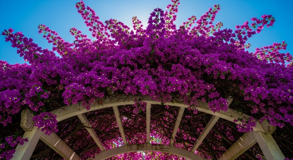 A wall completely swallowed by thousands of electric-pink bracts. A trellis dripping in orange-coral clusters. An archway lit up in deep violet — so vivid it almost looks painted on.