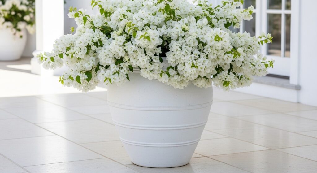 White bougainvillea has a quiet elegance that works beautifully in modern, minimalist, or tropical garden designs.
