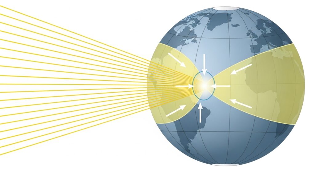 At high latitudes (near the poles), the same sunlight hits at a shallow, oblique angle. The energy spreads across a much wider area, making it far less intense. Imagine shining a flashlight straight down onto a table versus tilting it sideways — the tilted beam covers more surface but gives less light per square inch.
