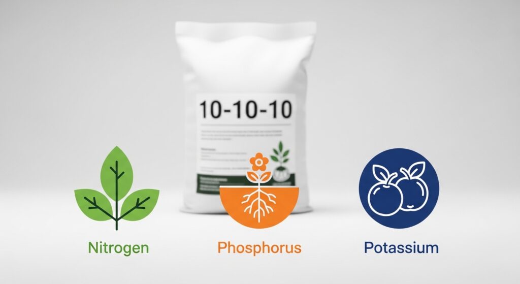 Every fertilizer package shows three numbers — for example, 10-10-10 or 5-10-5. These represent the percentage by weight of: