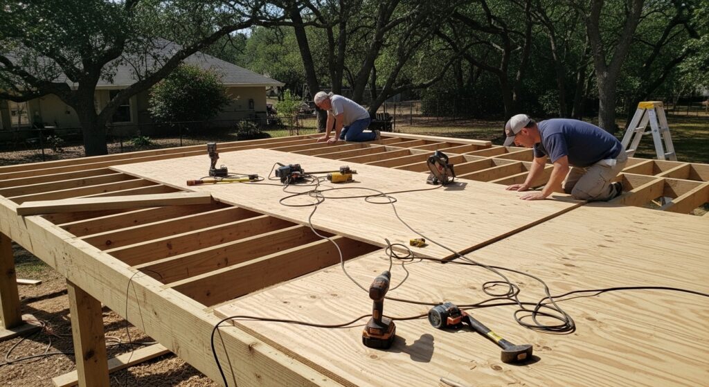 Always use tongue-and-groove (T&G) panels for subfloors — they eliminate edge sag between joists.