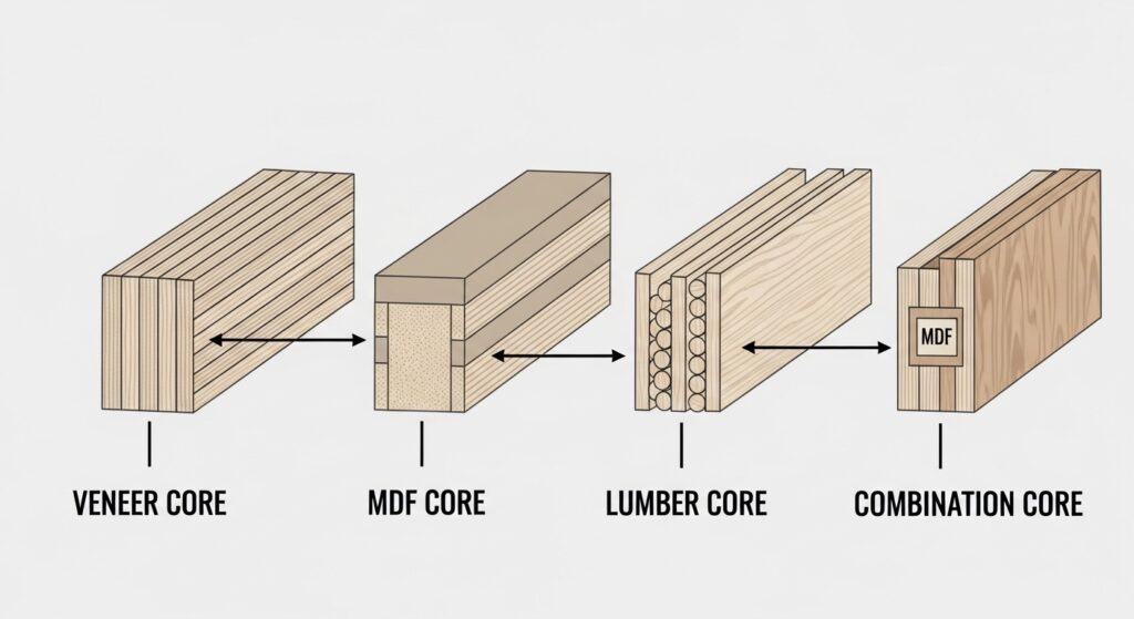 The face veneer is what you see. The core is what determines how the panel performs. And this distinction matters more than most beginners realize.