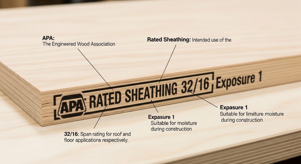 4. Read the Grade Stamp The grade stamp (usually on the back or end of the panel) tells you everything: APA certification, species group, thickness, span rating, and exposure rating. Don’t assume — always read it.