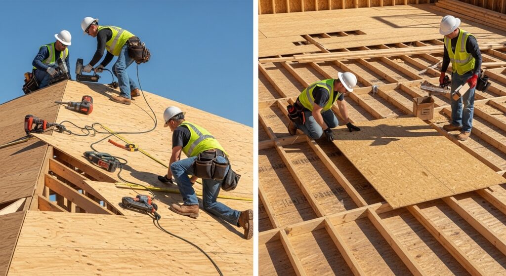 Wall sheathing is nailed to studs and serves as a structural diaphragm, while roof sheathing spans between rafters to form the base for roofing material.