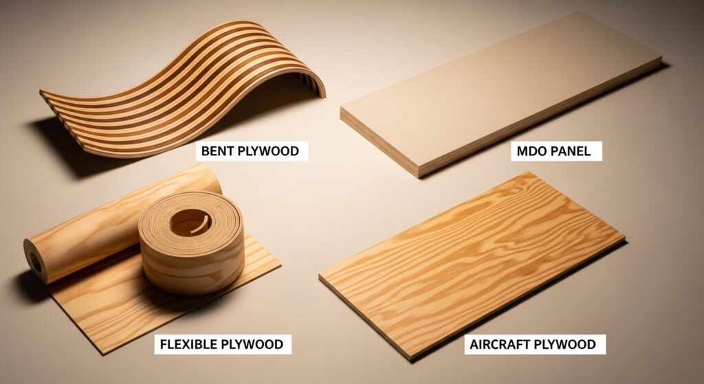 Flexible plywood is manufactured with all plies running in the same direction, which allows the panel to be bent into curved shapes. It’s available in thin sheets (⅛” and ¼”) and is used for curved furniture, archways, curved cabinetry, and decorative millwork.
