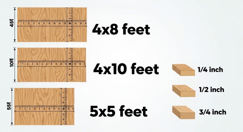 Standard size: 4×8 feet, ⅜” to ¾” thickness Common species: Southern yellow pine, Douglas fir