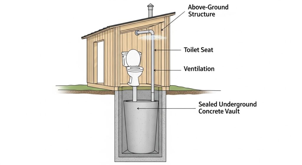 A vault toilet is a waterless, non-flushing restroom system built over a sealed underground storage container — called a vault — that holds human waste. Unlike a standard flush toilet connected to a septic system or sewer line, a vault toilet requires no water, no plumbing connections, and no electricity to operate.