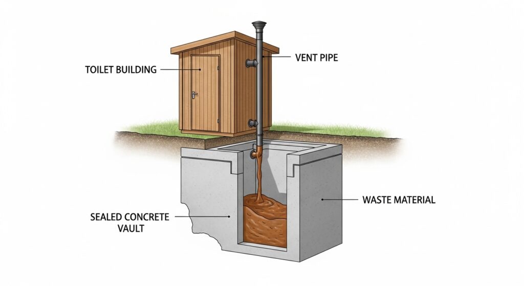 The term “vault” refers to the impermeable underground container (typically made of pre-cast concrete or fiberglass) that collects and temporarily stores waste. When the vault reaches capacity, it is pumped out by a specialized service vehicle — similar to how portable toilets are maintained.