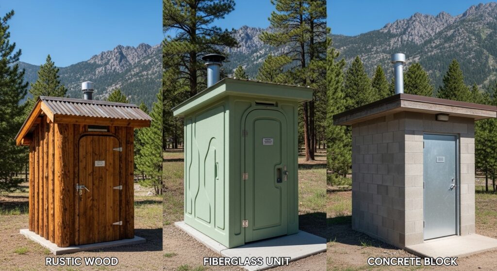 Single-Unit Fiberglass Structures These look similar to portable toilets but are more permanent and built directly over a vault. They’re lightweight, easy to install, and common at low-traffic trailheads.
